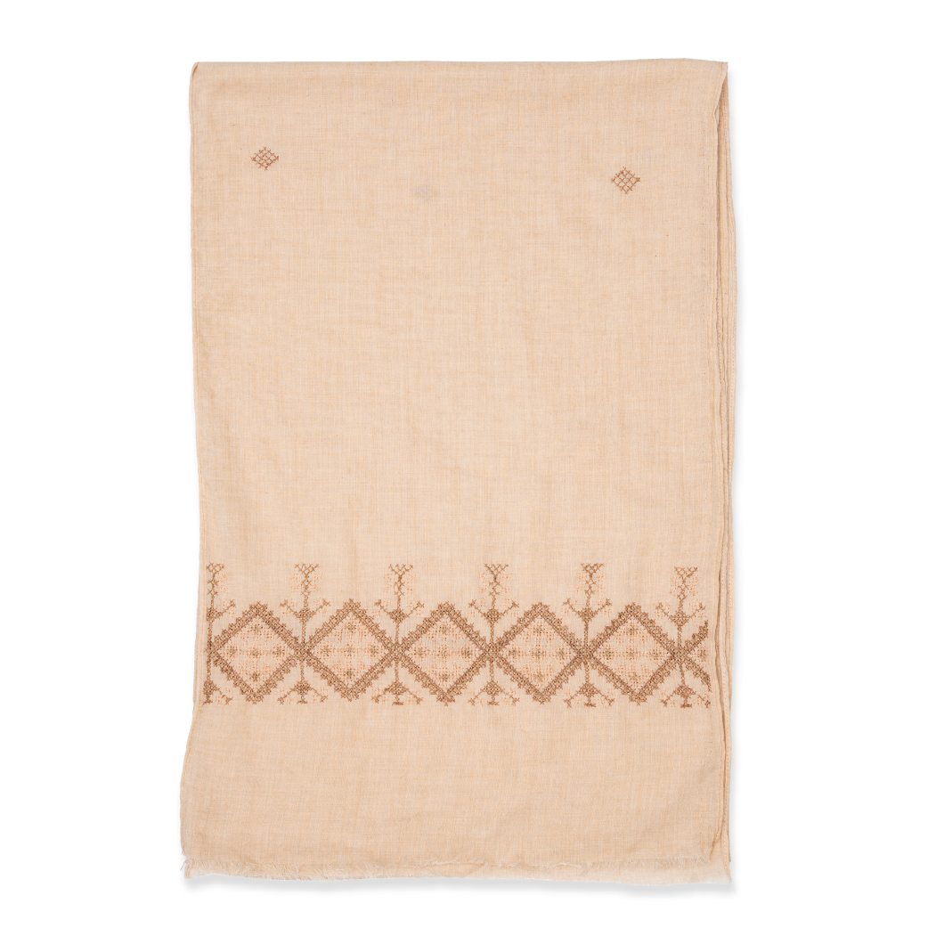 This airy and versatile cotton scarf is delicately embroidered with the traditional flower motif from the Jaffa area. Made by the skilled artisans of Idna village in the Hebron area in the south of the West Bank.
