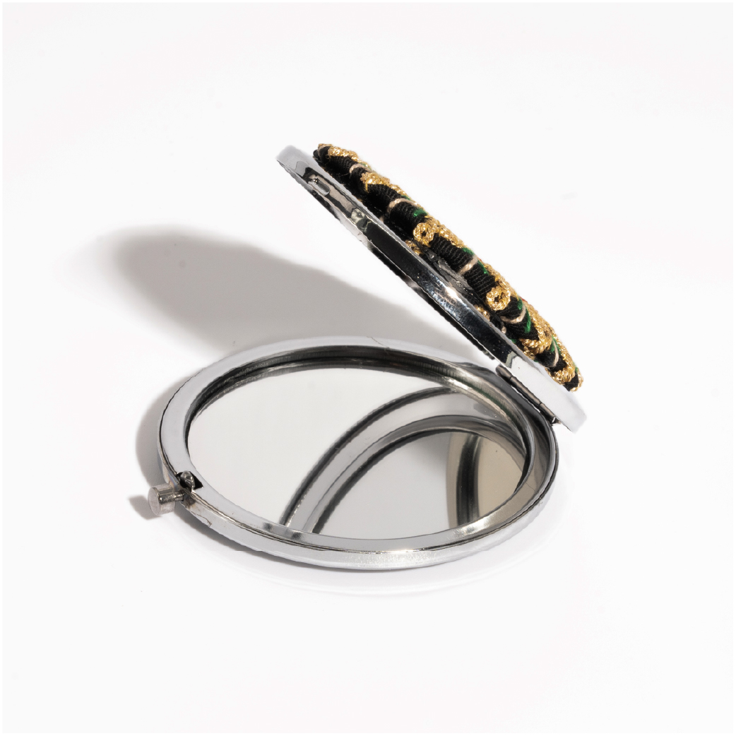 This portable mirror is beautifully embroidered with Tahriri, the unique couching technique from Bethlehem. It can fit in your make-up purse for touch-ups on the go. Features a standard mirror and a magnifying mirror inside.