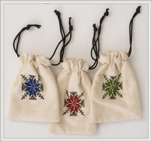 These precious embroidered bags come with Canaanite Star design. They make a perfect cover for a bar of olive oil soap or great stuffing for Christmas stockings. Available in 3 colors: Sea of Galilee, Summak Red, Olive Green (photo, from the left).